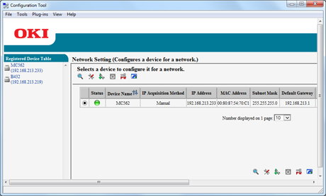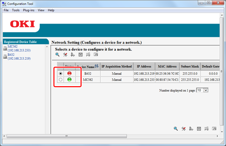 Clicking on an item field (status, device name (printer name), IP address acquisition method, IP address, MAC address, subnet mask, default gateway, NIC model name, NIC program version, and enable/disable setting for device settings (Web)) sorts information based on the values of the clicked item.