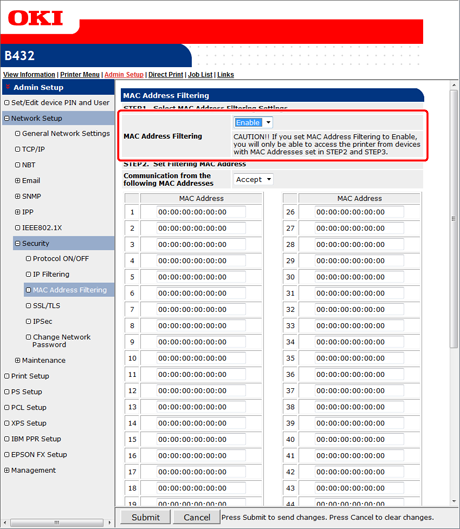 Be sure to specify the correct MAC address. An incorrect entry of a MAC address does not allow for access to the printer from a network. Use care when setting.