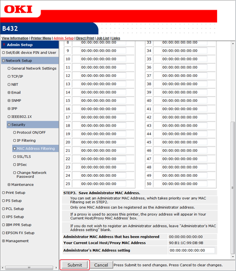 If nothing is registered in [Administrator's MAC Address setting], access to the printer may not be allowed depending on the settings in [STEP2].