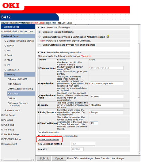 To change [Key Exchange method] and [Key size ], click [Change these settings].