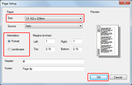 To print on envelopes in landscape orientation (printing on horizontal envelopes with the flaps on the right side), select the landscape orientation icon for [Orientation] on the [Page Setup] screen.