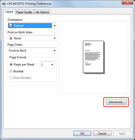 The [OKI B432(PS) Advanced Options] screen closes.