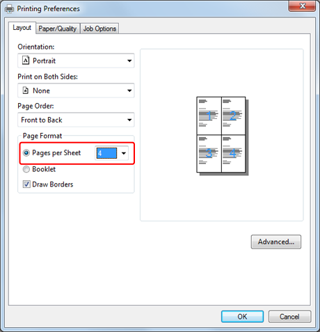 Select [Draw Borders] if necessary. Page layout can also be changed via [Advanced] > [Pages per Sheet Layout].