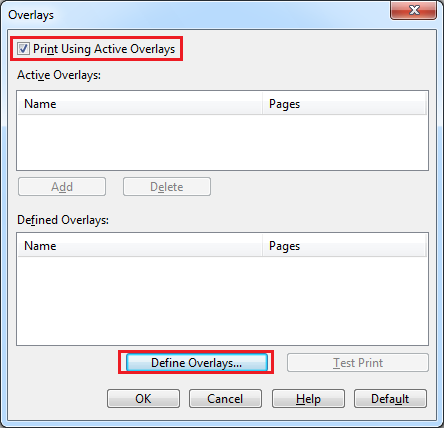 Select the [Print Using Active Overlays] check box on the [Overlays] screen, and then click [Define Overlays].