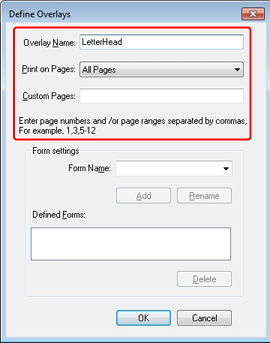 Enter a name in [Overlay Name], and then select from [Print on Pages] the pages to which the overlay is applied. To apply an overlay by specifying the pages, select [Custom], and then enter the pages to which the overlay is applied in [Custom Pages].