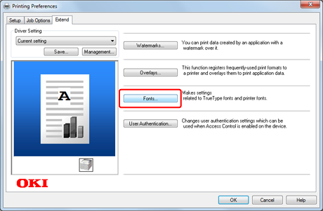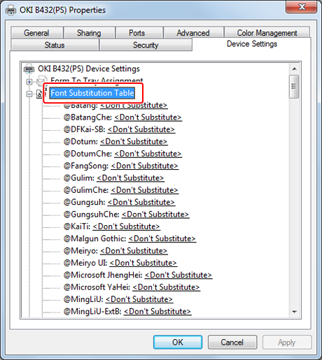 Replace a TrueType font with a printer font by using [Font Substitution Table] on the [Device Settings] tab.