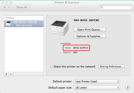Check that the printer is displayed in [Printer], and [B432-AirPrint] is displayed in [Kind].