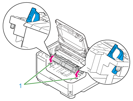 near the handles on both sides of the transcription unit into the holes (1) of the printer main unit.