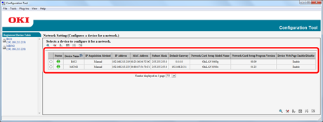 Clicking on an item field (status, device name (printer name), IP address acquisition method, IP address, MAC address, subnet mask, default gateway, NIC model name, NIC program version, and enable/disable setting for device settings (Web)) sorts information based on the values of the clicked item.