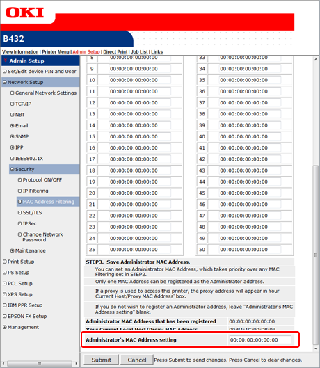 If you do not want to register the administrator's MAC address, set 00:00:00:00:00:00 to the [Administrator's MAC Address setting] filed.