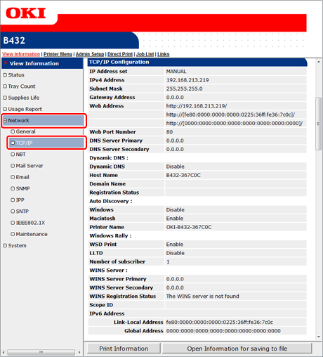 An IPv6 address is automatically assigned. The obtained IPv6 address is displayed on the Web page and the network setting information (Network Information).