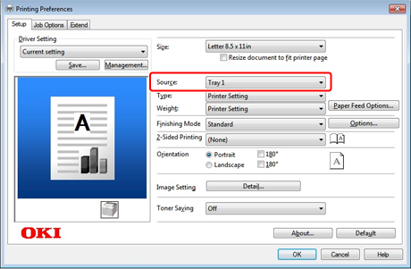 Select [Tray 1] for [Source] on the [Setup] tab.