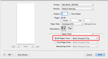 To print on envelopes in landscape orientation (printing on horizontal envelopes with the flaps on the right side), select the landscape orientation icon for [Orientation] on the [Page Setup] screen.