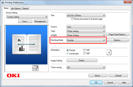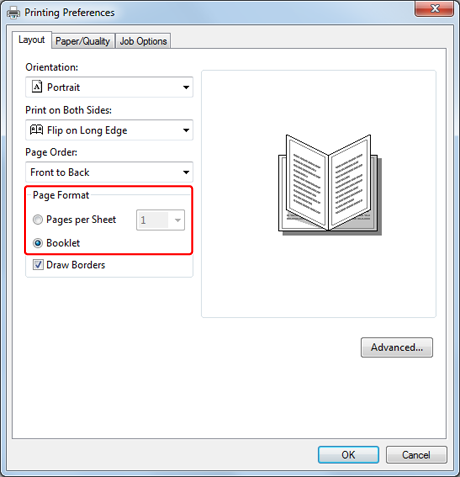If you are unable to use [Booklet] printing, select [Start] > [Devices and Printers], right-click the [OKI B432] icon, select [Printer properties] > [OKI B432(PCL)] > on the [Advanced] tab, and then select the [Enable advanced printing features] check box.