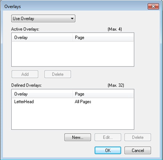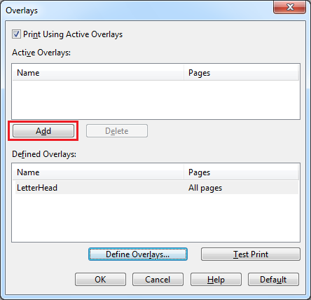 Select the [Print Using Active Overlays] check box on the [Overlays] screen, and then click [Define Overlays].
