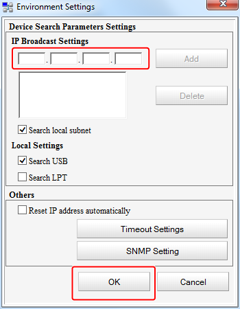 To change the range for searching for your printer, select "Register Device" in the "Tools" menu.