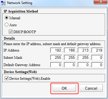 The settings for the Network Setting plug-in are displayed when the Network Setting plug-in is installed. You can set the IP address of your printer, enable or disable device settings, and the display of the Web page.