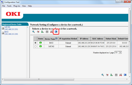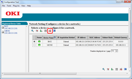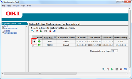 Clicking on an item field (status, device name (printer name), IP address acquisition method, IP address, MAC address, subnet mask, default gateway, NIC model name, NIC program version, and enable/disable setting for device settings (Web)) sorts information based on the values of the clicked item.