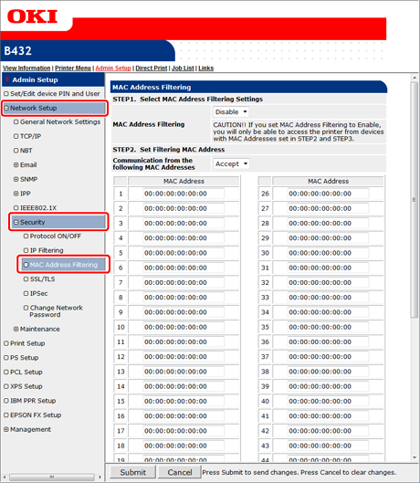 Be sure to specify the correct MAC address. An incorrect entry of a MAC address does not allow for access to the printer from a network. Use care when setting.