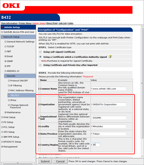 For details on issuing an entry certificate, follow the procedure provided by the certificate authority if [Using a Certificate which a Certification Authority signed] is selected.