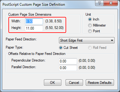 The [PostScript Custom Page Size Definition] screen closes.