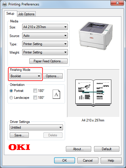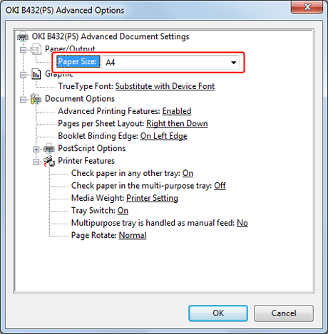 If you are unable to use [Booklet] printing, select [Start] > [Devices and Printers], right-click the [OKI B432] icon, select [Printer properties] > [OKI B432(PS)] > on the [Advanced] tab, and then select the [Enable advanced printing features] check box.