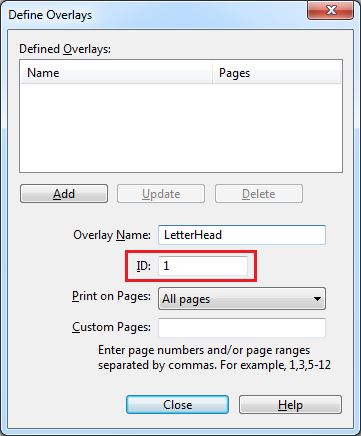 Enter a name in [Overlay Name], and then select from [Print on Pages] the pages to which the overlay is applied. To apply an overlay by specifying the pages, select [Custom], and then enter the pages to which the overlay is applied in [Custom Pages].