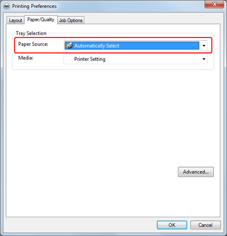 You can automatically select a tray (paper cassette (Tray 1 or Tray 2)) or MP tray that holds paper of the same size that is set with the printer driver.