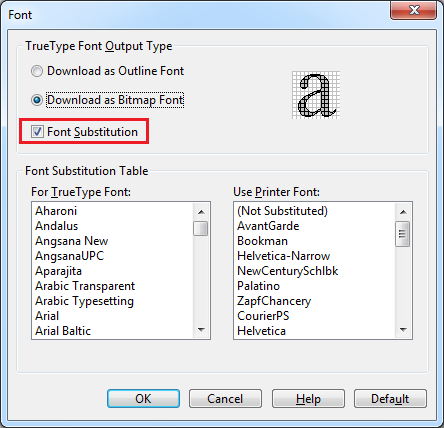 Select the [Font Substition] check box in [TrueType Font Output Type].