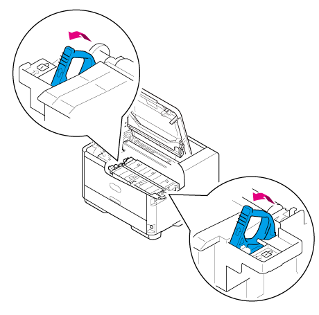 near the handles on both sides of the transcription unit into the holes (1) of the printer main unit.
